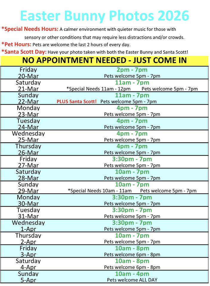 Visit the Bunny in Fountain Court. Digital photo packages are available with options to purchase prints. Reservations are recommended, walk-ups are not guaranteed. Pets are welcome!